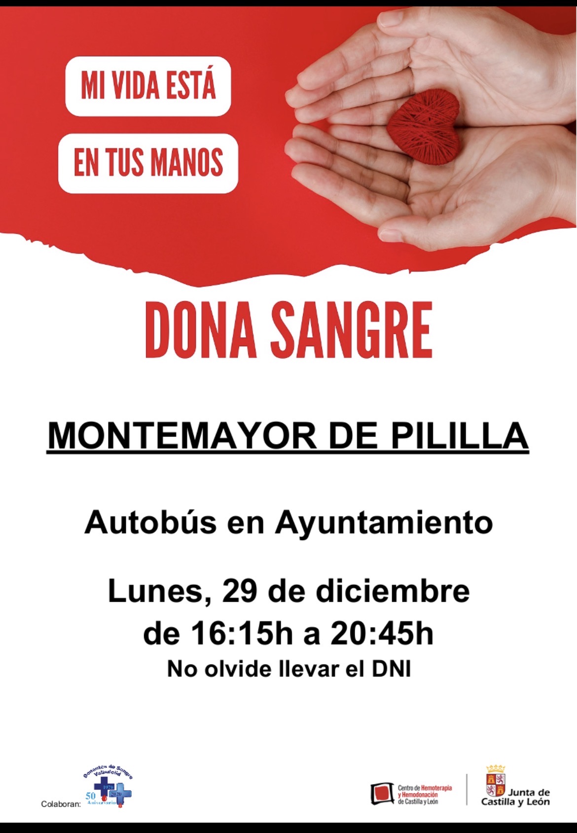 El lunes, 29 de diciembre de 2025, de 16:15 h a 20:45 h la unidad móvil realizará las extracciones en la Plaza Mayor, en el autobús de hemodonación. Esta actividad se traslada desde la Casa de la Cultura.