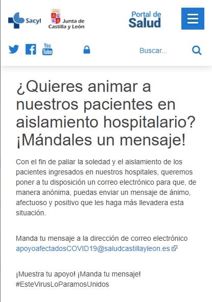 Con el fin de paliar la soledad y el aislamiento de los pacientes ingresados en los hospitales, SACYL pone a tu disposición un correo electrónico para que, de manera anónima, puedas enviar un mensaje de ánimo, afectuoso y positivo que les haga más llevadera esta situación.